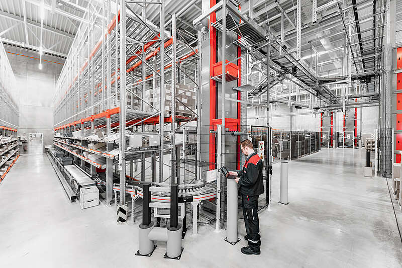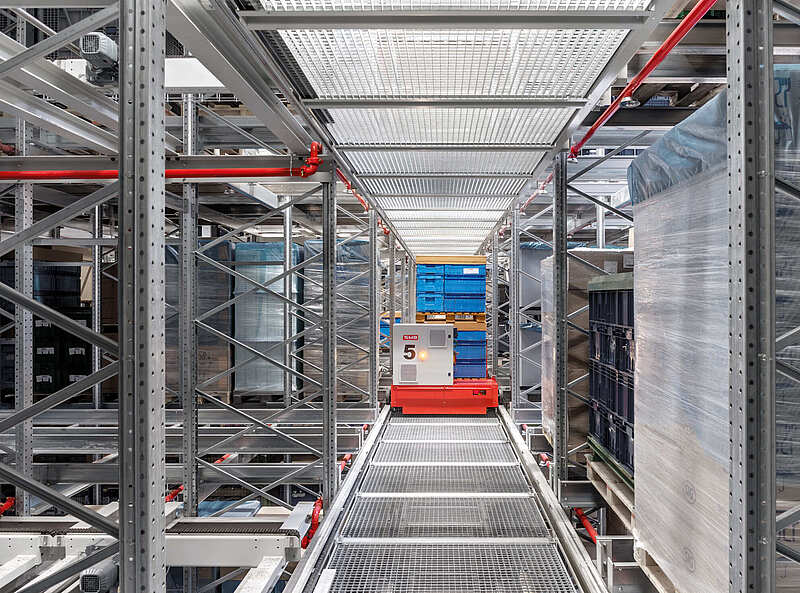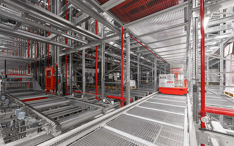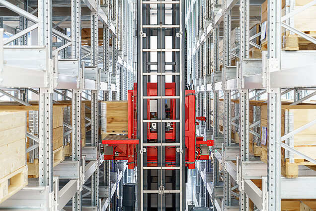 Traditional storage and retrieval systems, such as stacker cranes, are not necessary. Instead, vertical conveyors transport the pallets via high-performance lifts to the desired levels.
