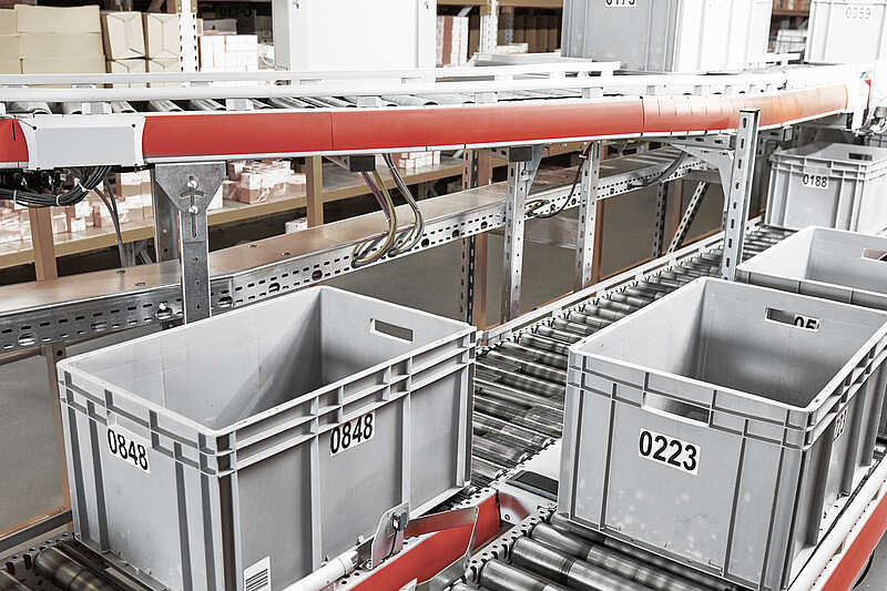 Cartons sail through the warehouse on their way to their intended destination. Filled drums leave the production line and are automatically transferred to a pallet. This is all made possible by container conveyor systems, which transport individual containers between various stages of the logistics chain.