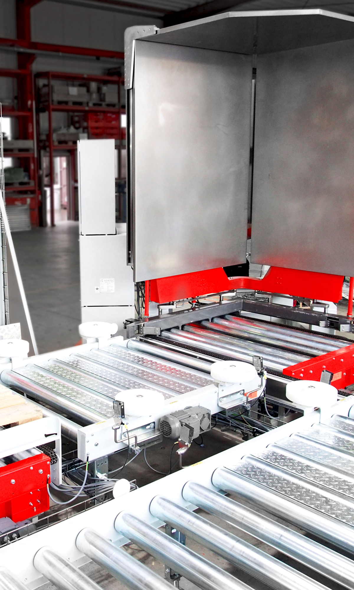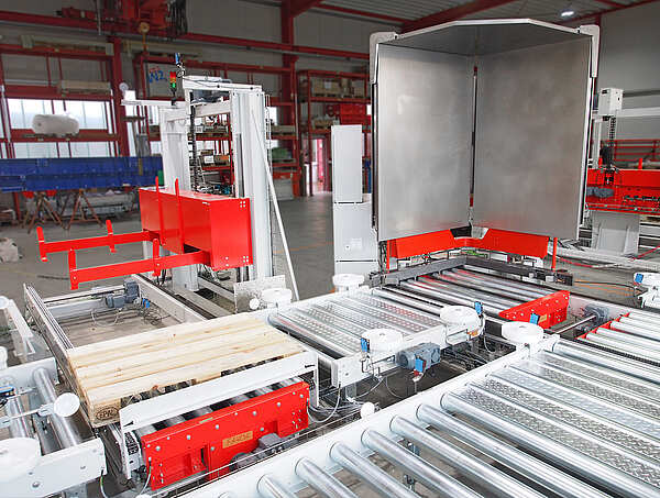 We produce the tilting pallet exchanger in cooperation with the company NORTEC Automation GmbH. It is delivered completely pre-assembled and is available in different performance classes. Expansion functions, such as a protective sheet separator, can be booked individually. The control software of the pallet changer is created by specialists so that the palletizer can be individually adapted at any time. In continuous quality assurance, we incorporate the experiences of the users.