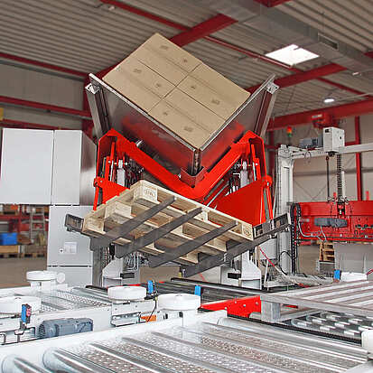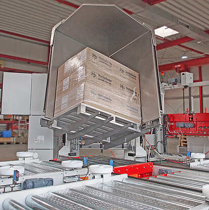 The tilting method can be used for repalletizing all types of cartons, trays and containers. The SMB tilting pallet exchanger gently exchanges transport pallets using a fully automatic rotating and tilting movement. The tilting device neither pushes nor pushes the load, thus preventing damage caused by faulty pallets. The goods are repalletized in any order and optimally positioned on the pallet to achieve the best possible stacking pattern.