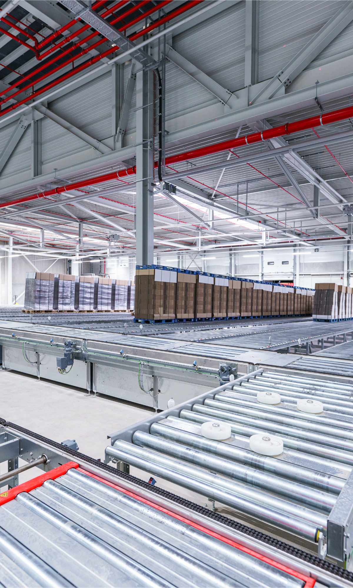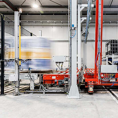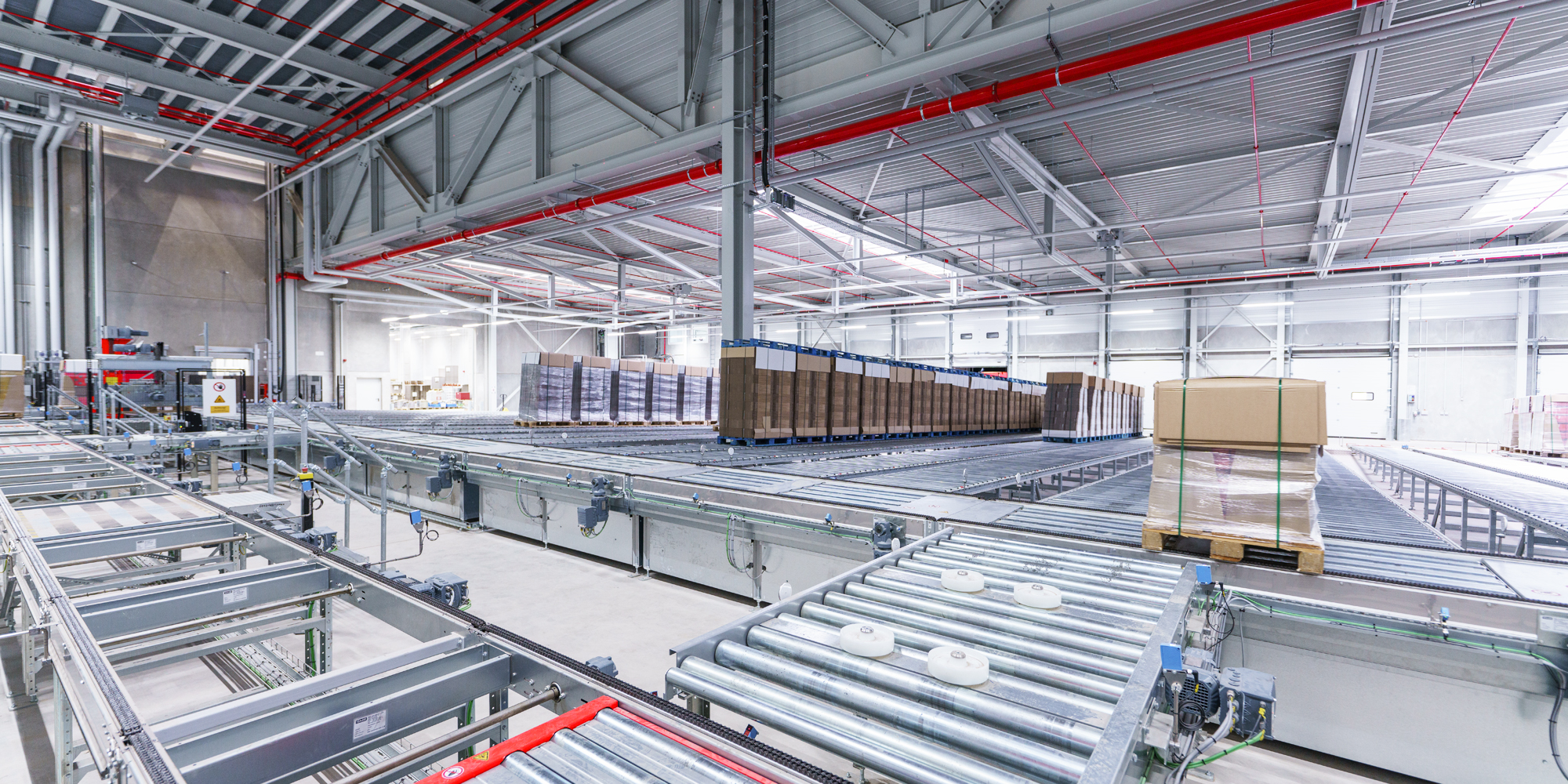 The ideal components for distributing pallets to different conveyor lines: SMB transport vehicles and shuttles. Their unique selling point: the shuttle can cover long distances quickly and easily. Roller tracks and chain conveyors reach their limits here.