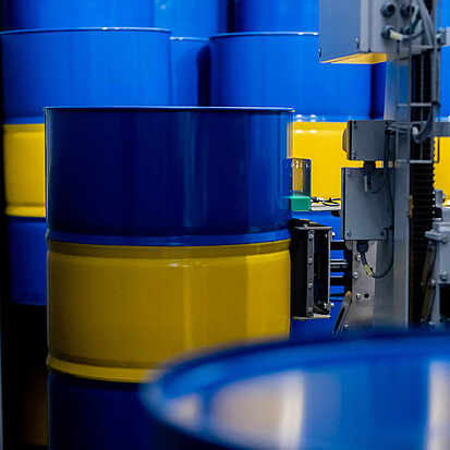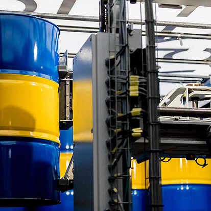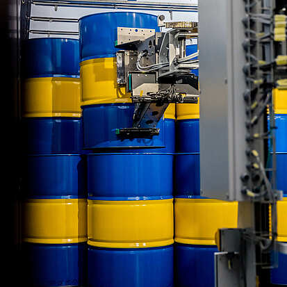 The SMB drum discharger is used to unload empty drums onto swap bodies or directly onto a truck trailer. The automatic discharger can also be used on the side as an option to drive up to several swap bodies in parallel or one after the other. Up to two separate drum dischargers can unload the swap bodies alternately, so that the availability of empty drums can be further increased or different drum types can be unloaded in parallel.