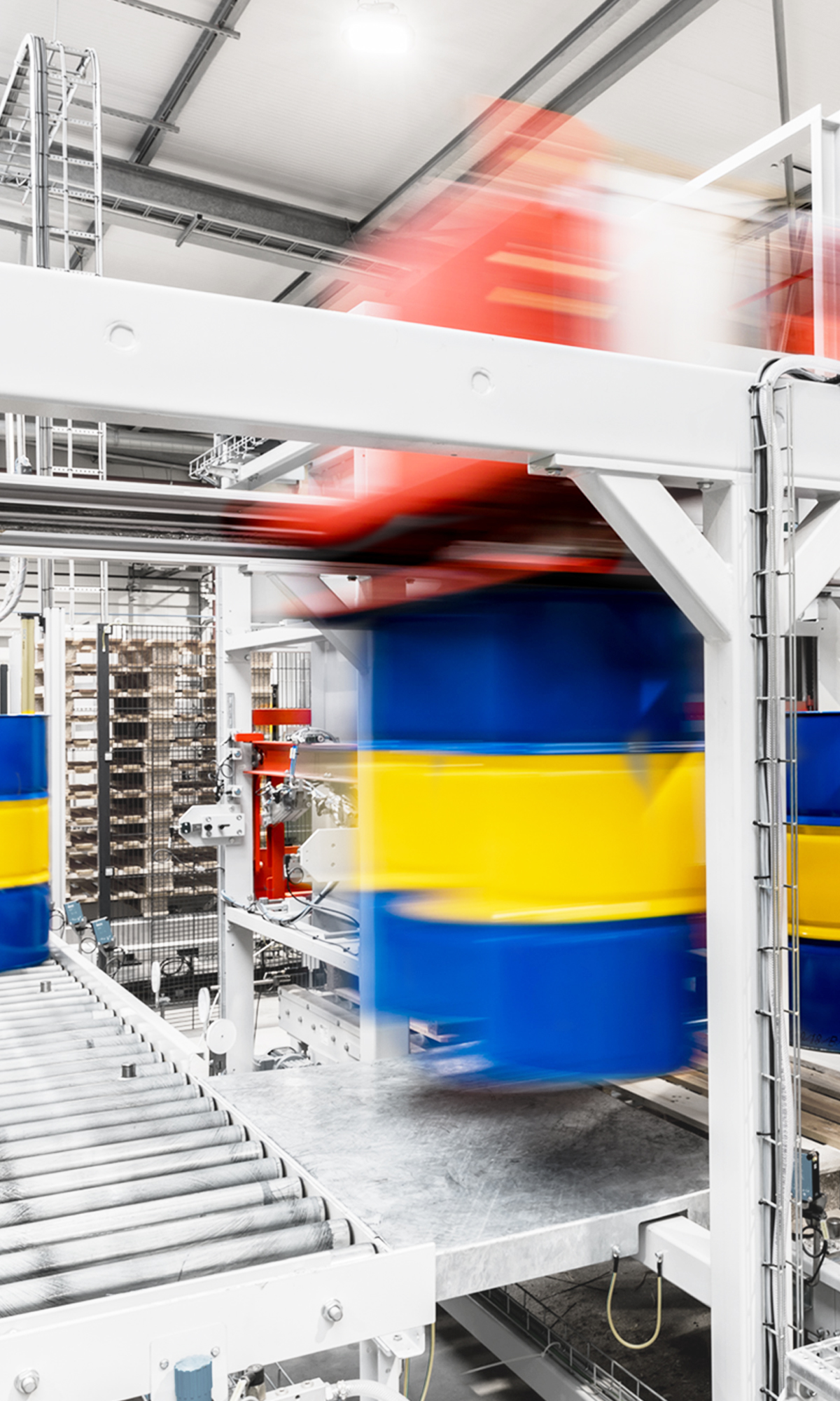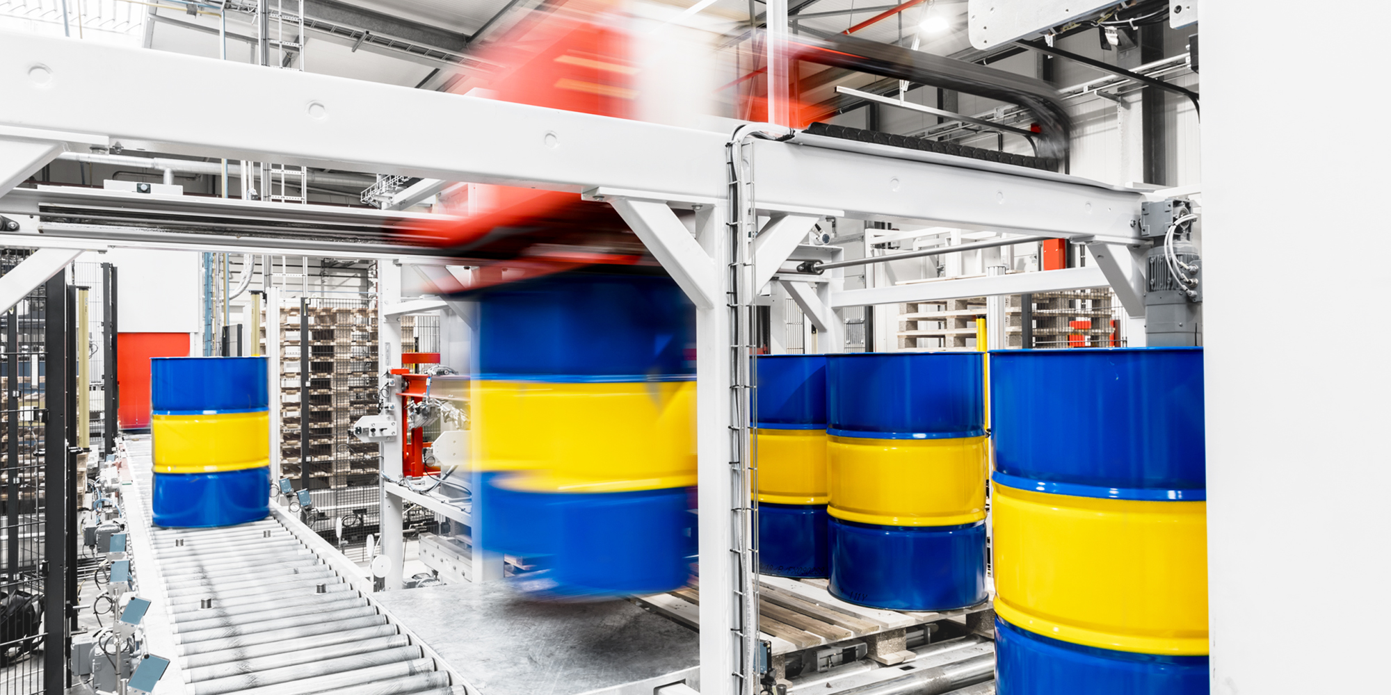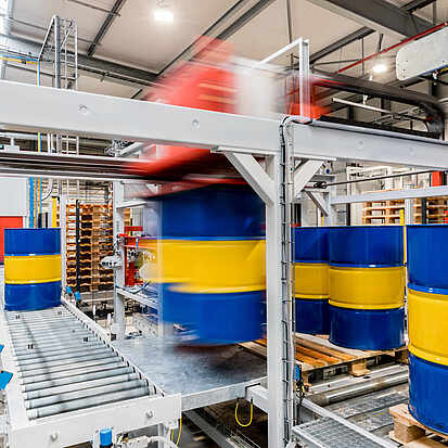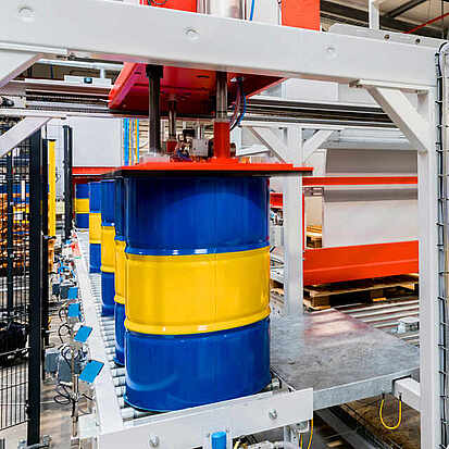 Absorbent loads, such as drums or canisters, are automatically palletized using a vacuum. Four to nine containers can be stacked on a pallet at the same time, either on top of each other or next to each other. This makes vacuum palletizers the ideal addition to filling systems. They place the containers on the pallet precisely and in compliance with all safety standards. This also makes it possible to handle drums with toxic contents.