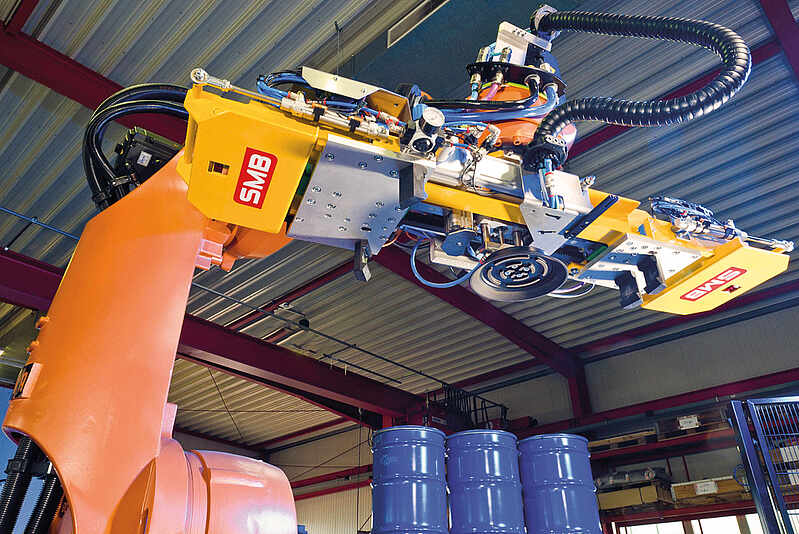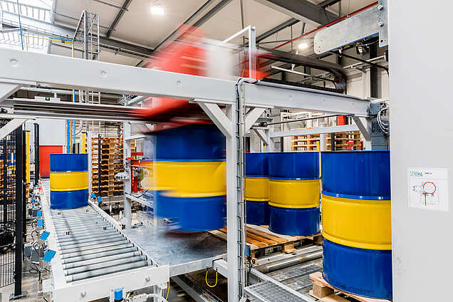 For large containers, such as barrels or Hobbocks, sliding palletizers or vacuum palletizers are used. When used in combination with our filling systems, they introduce a high degree of automation to the company's internal logistics chain.